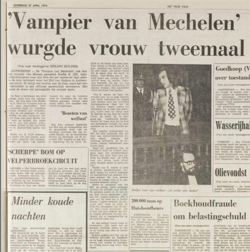 Nu is het wel tijd om te gaan. Een cipier begeleidt Evi naar de uitgang. Als hij met haar door de gangen loopt vraagt hij: ‘Weet u wel wie dat is van die foto?’ Nee, dat weet ze niet. ‘Staf van Eyken, hij zit hier het langst van allemaal.’ De naam komt haar vaag bekend voor, maar doet niet echt een belletje rinkelen. Als de cipier de zware deur voor haar opendoet zegt hij: ‘Hij is de Vampier van Muizen.’