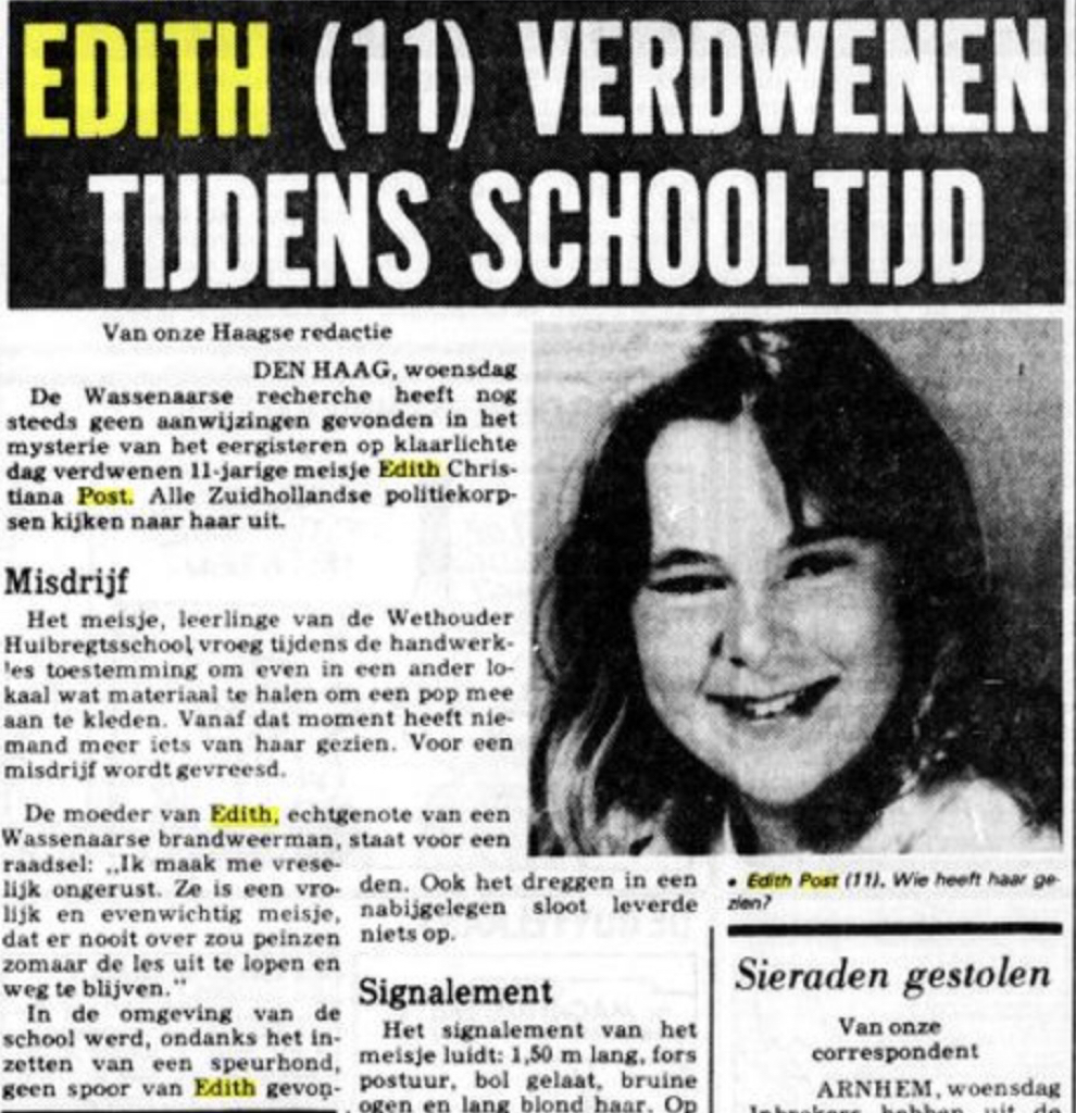 De elfjarige Edith Post zat op de Wethouder Huibregtseschool in Wassenaar. Ze vroeg of ze even de klas uit mocht. Ze had iets nodig uit een ander lokaal maar kwam niet meer terug. Het enige wat leerkrachten en leerlingen was opgevallen was dat er een man rondliep met een houthakkers-blouse en een schop in zijn hand. Dit gebeurde op 29 september 1980. Op 2 oktober werd haar lichaam gevonden door een wandelaar in een meertje in de duinen, dichtbij haar school. Ze had een ingeslagen schedel. Waarschijnlijk was ze met een boomtak op haar hoofd geslagen. De bebloede tak werd vlakbij gevonden. De politie vond een sleepspoor van ongeveer 25 meter. Het was onduidelijk of ze seksueel misbruikt was. Er werden verwondingen aangetroffen aan haar linkerhand en gezicht er waren wurgsporen bij haar hals. Haar oorbellen waren verdwenen.